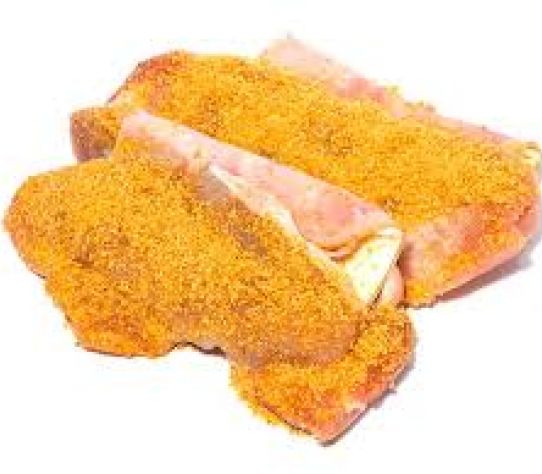 Varkensfilet gevuld met ham en kaas. Daarna gepaneerd.