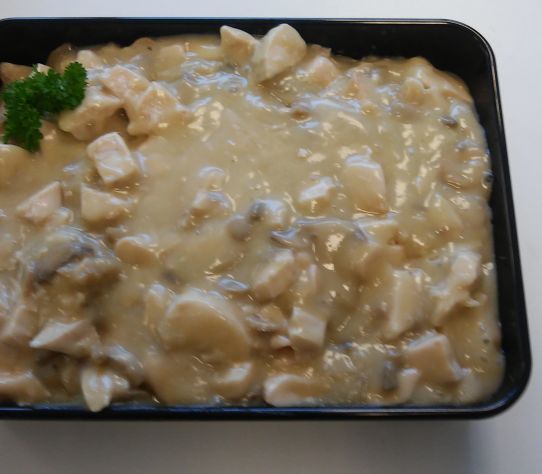 Gemaakt van eigen getrokken kippenbouillon en zacht gekookt kippenvlees. U heeft 250 gram nodig per persoon. Lekker om pasteitjes mee te vullen als voorgerecht of bij de brunch. Maar ook met rijst als hoofdgerecht