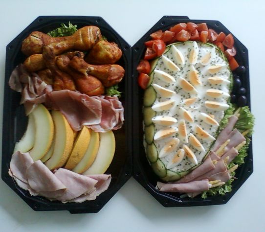 Koude schotel, komkommer, tomaat,ei,ham aspergerolletjes, drumsticks,meloen, Coburgerham, varkensfilet.