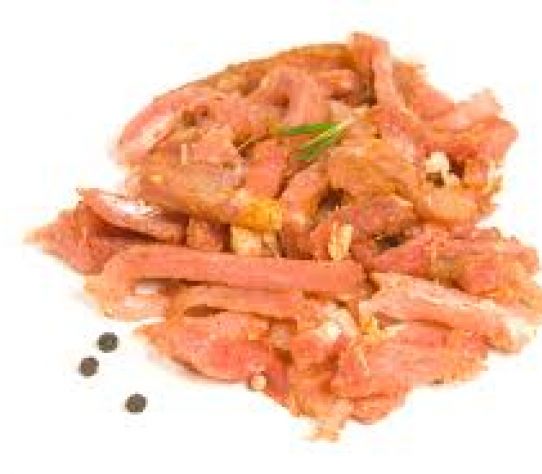 Reepjes varkensvlees gekruid met pittige kruiden en paprika reepjes. Erg lekker in een pita broodje met knoflooksaus.