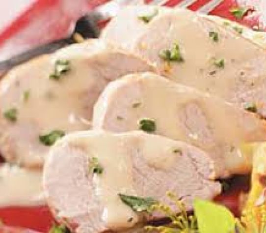 Gebakken stukjes varkenshaas in een romige champignonsaus. U heeft ongeveer 200 tot 250 gram per persoon nodig.